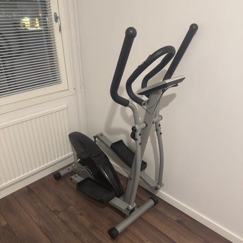 Maxfit Crosstrainer träningsmaskin i silverfärg. Utrustad med digital display för att visa träningsdata. Passar för inomhusträning och konditionsträning.