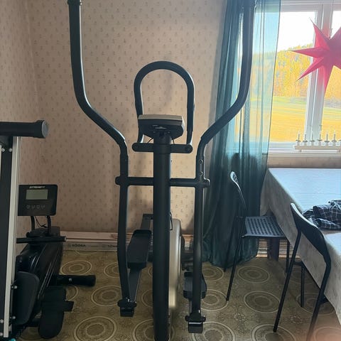Life Gear Crosstrainer träningsmaskin med digital display och handpulsmätare. Utrustad med pedaler och handtag för helkroppsträning. Maskinen är lämplig för hemmabruk och erbjuder en lågintensiv konditionsträning.
