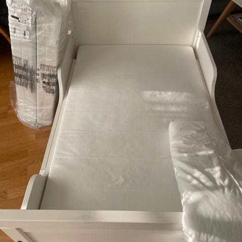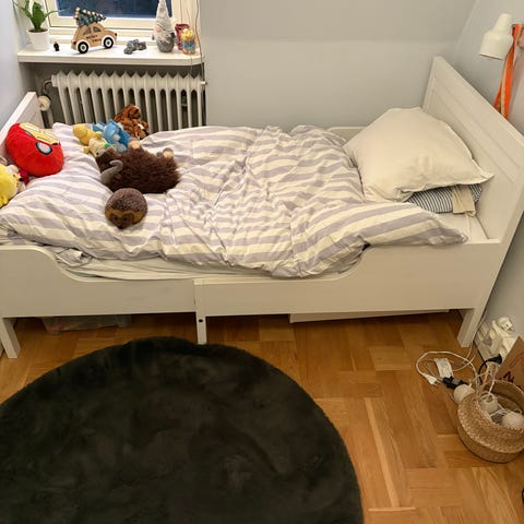 Utdragbar barnsäng/juniorsäng Sundvik med ribbotten från Ikea. Sängen kan dras ut i takt med att barnet växer. Bredd 80 cm och minsta mått på sängen är 137 cm. Sängen kan dras ut till 200 cm. Nypris 1995:-