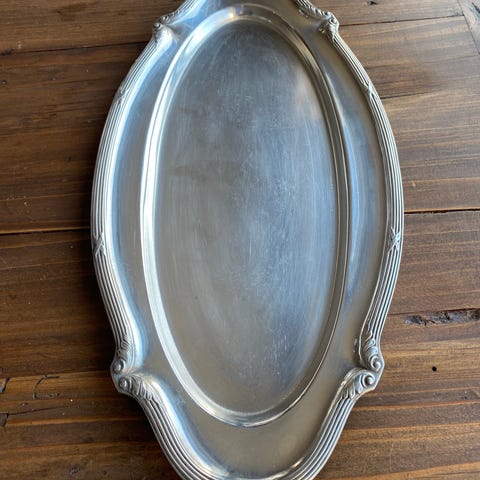 Nysilver fat med ett dekorativt utskuret mönster runt kanten. Fatet är runt och har en blank yta med reflekterande egenskaper. Passar för servering eller som dekorativt föremål.