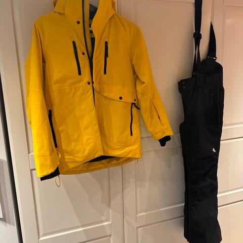 Byxorna kan användas med eller utan de avtagbara hängslena. Byxorna har dragkedja och knapp samt två fickor med dragkedja. Kardborrefästen i sidan för justering av midjan. Snölås vid benslut. Lite slitage i rumpan.