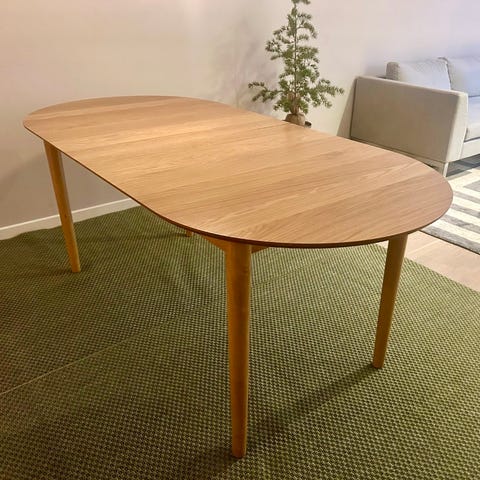 Träbord från Jysk med 6 platser och två extra skivor för förlängning om 0,45cm vardera. Tror bordet heter SKOVLUNDE natur ek.