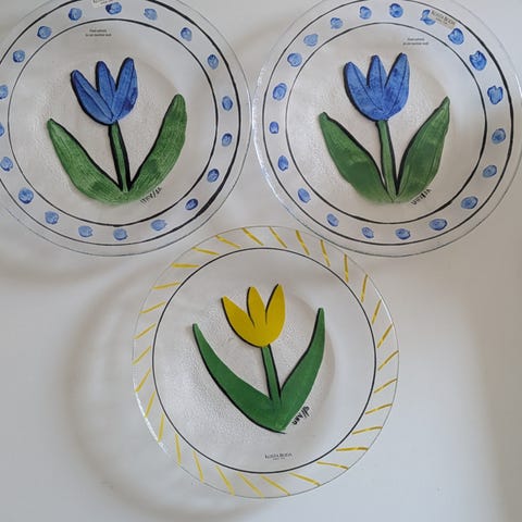 Design: Fatet har en karakteristisk, handmålad tulpan i klara färger (röd, orange, gul, grön, blå) med blå prickar runt kanten.