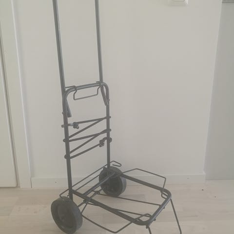 Hopfällbar vagn med hjul, utrustad med handtag och spännband för att säkra last. Vagnen är avsedd för transport av olika föremål och är lätt att förvara tack vare sin hopfällbara design.