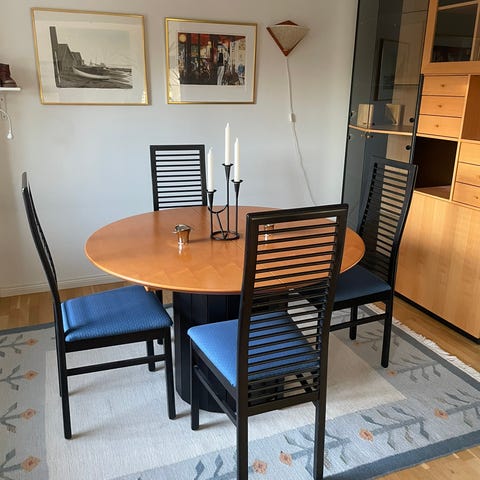 Skänk, vitrinskåp, matbordet har även iläggsskiva. .