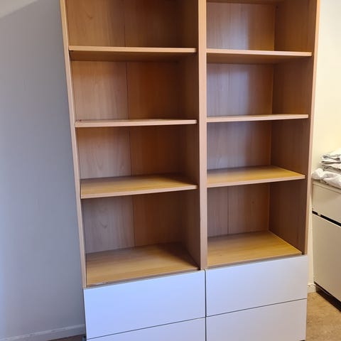 Två bokhyllor med inbyggda lampor på de tre översta hyllplanen. I fint skick, säljes pga flytt. Det är två bokhyllor som är fristående från varandra, men exakt likadana.