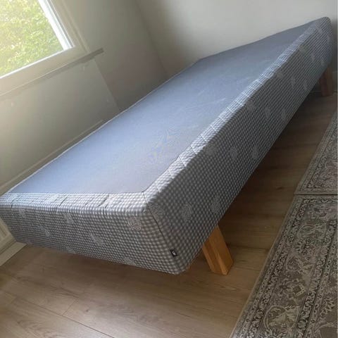 Säng säljes med några år på nacken men fortfarande i bra skick! Egengjorda ben massivt trä.