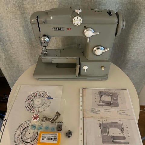 Pfaff symaskin modell 332. I utmärkt skick. Nyligen servad och fungerar mycket bra. Levereras med alla tillbehör inklusive manual, originalpedal och väska, olika pressarfötter och allt du ser på bilderna. Denna kraftfulla symaskin är lämplig för olika sömnadsprojekt och alla typer av lätt och tung sömnad inklusive kapell, jeans, skinn häst, täcke, elastisk och mm.