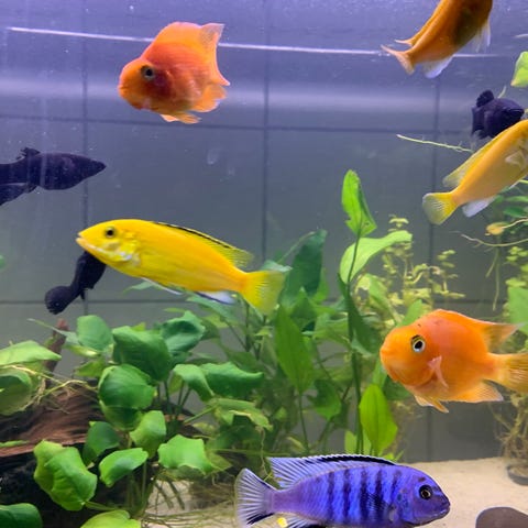 Ensam fjärilsiklid och en Ancistrus gul stor hane söker nytt hem. Friska och äter bra.