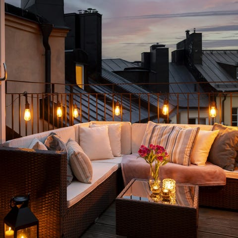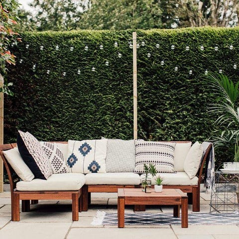 ÄPPLARÖ utomhussoffa med soffbord och vita kuddar