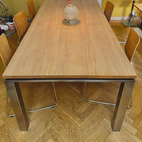Säljer detta stora, maffiga och lyxiga bord med stenskivor som är i massiv ek! Bordet är i mycket fint skick. Fungerar med båda tre eller fyra stolar på vardera långsida (se bild 5 & 6). Säljes på grund av flytt.