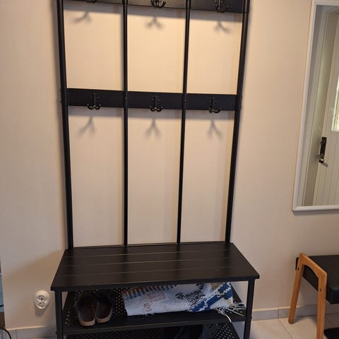 Säljer hallmöbel ELVERUM stål svart från Jysk. Den har tre skorställningar. Första skoställningen är lite skadad, men går fortfarande bra att användas.