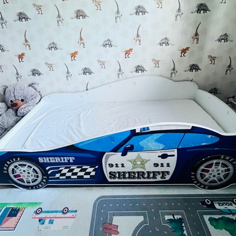 Bil Barnsäng, skum madrass följer med om man vill , madrassskydd använts hela tiden.