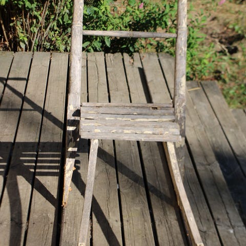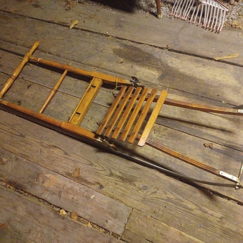 Sparken har en enkel design med en träsits för sittande och en metallram som fungerar som styr- och stödstruktur. Passar för vuxen att åka på snö eller is.