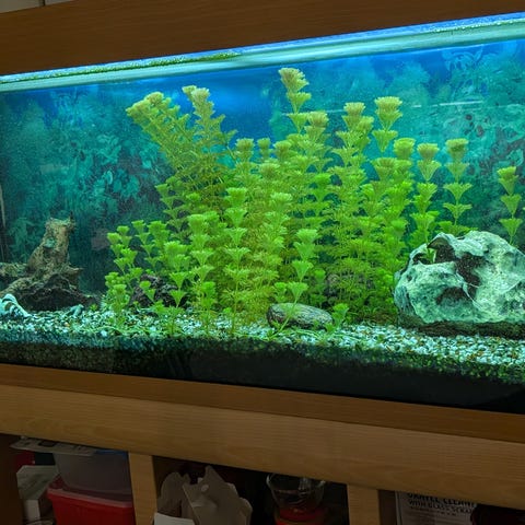 Akvarium med integrerad växtbakgrund och belysning. Innehåller dekorativa växter, sten och trädetaljer. Utrustad med filter och belysningssystem. Passar för akvariefiskar och vattenlevande djur.