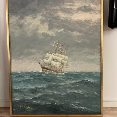 Oljemålning på duk av Helsingborgskonstnären Åke Malmström från 1976 föreställande ett segelfartyg på havet. Målningen visar detaljerade vågor och en molnig himmel. Inramad med en enkel förgylld träram. Signerad och daterad 1976. Målningen är 64 cm bred och 54 cm hög.