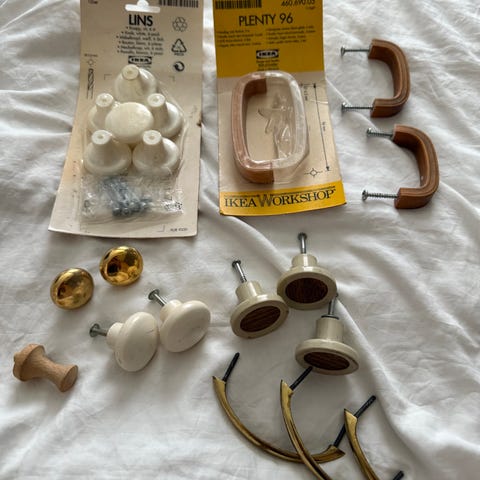 28 handtag i metall inklusive skruvar säljes. De är i bra skick. Längd från kant till kant är 17 cm (CC-mått 12,8).