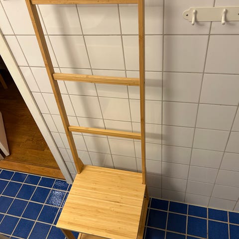 Säljer en IKEA HJÄLMAREN handdukstege i vit . Perfekt för handdukar, filtar eller kläder i badrummet eller sovrummet. Behöver ej borras i väggen men finns möjligheten för stabilitet.