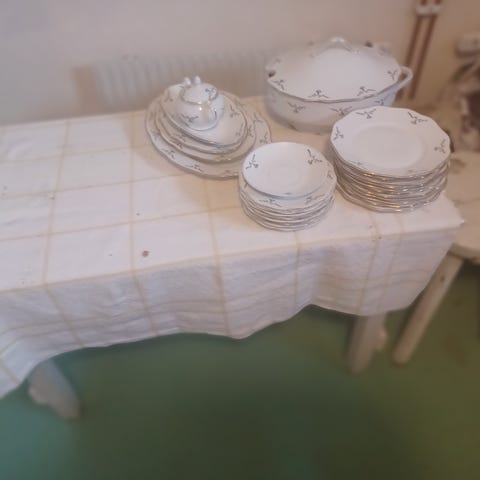 Beskrivning: En klassisk och tidlös matservis i vitt porslin och eleganta guldkanter. Modellen heter ”Claudia” och är tillverkad av välkända MZ Altrohlau i dåvarande Tjeckoslovakien och är kompletterat med matchande fruktskålar från EPIAG. Perfekt för festliga dukningar där man vill ha en enhetlig och lyxig känsla.