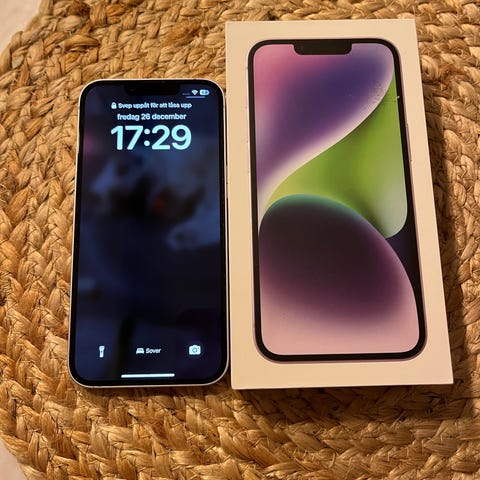 Apple iPhone 14 128GB midnatt. Inköpt aug 24, kvitto finns. Helt felfri, inga repor, batterihälsa 88%. Förpackning och laddkabel medföljer. Kan skickas.