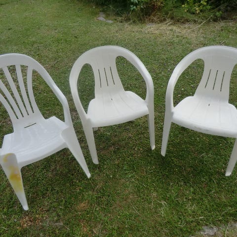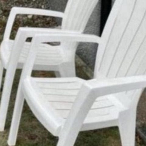 2 Plaststolar vita stapelbara + 2 Ihopfällbara utestolar