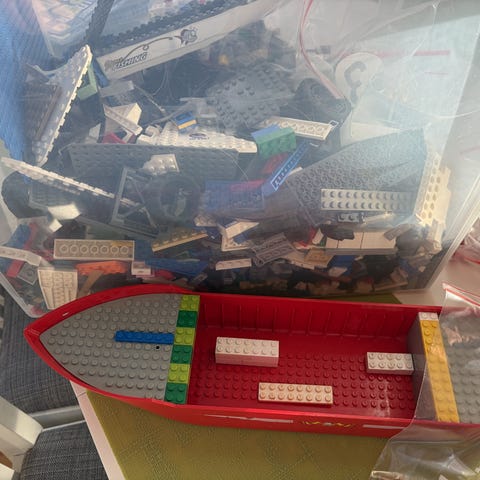 Finns en del byggen, några har gått sönder i flytt men går att bygga ihop igen, resten är löst Lego. Några instruktioner medföljer.