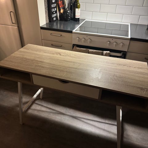 Vitt skrivbord i bra skick. Har en låda och ett skåp för förvaring. Funkar bra som skrivbord eller sminkbord. Stabilt och enkelt att hålla rent.