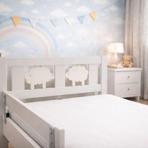 IKEA Enkel sängar barn säng i vit färg. Sängen är avsedd för barn och har en enkel design med en låg ram och sidor som ger stöd. Passar som en grundläggande sovplats för barn.