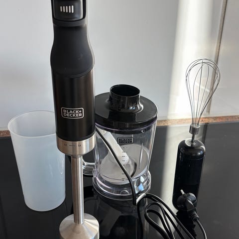 Kraftfull stavmixer inklusive visp och mixerbehållare. Utrustad med flera tillbehör för olika matlagningsuppgifter. Passar för användning i köket för att mixa, vispa och blanda ingredienser.