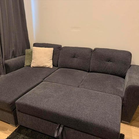 Marslev bäddsoffa från Jysk med förvaringsutrymme i schäslondelen. Har några år på nacken och är i således använt skick. En fläck på divandelen som säkert går att få bort.