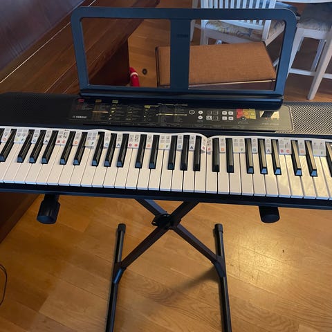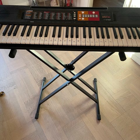 Yamaha PSR-340 keyboard med digital display, och flera ljudalternativ. Köpt begagnad för ca ett år sedan. Den fungerar som den ska, men kan tänka mig att den har några år på nacken. Tejpen med noterna går att ta bort om man vill.