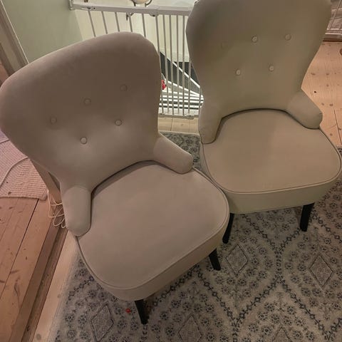 Säljer 2 fåtöljer Ikea havsten i mycket gott skick. Enbart använda sparsamt inomhus. Alla överdrag tvättbara i maskin vilket jag har gjort idag. Sköna att sitta i och lätta att montera isär. Säljer då vi gör om i tomårsdotterns rum. Rök och djurfritt hem. Finns på lilla Essingen. Nypris för enbart dynor 1500 skr, för dynor och fåtölj 2995. Säljer helst tillsammans för 1800, annars 1000 skr/styck.