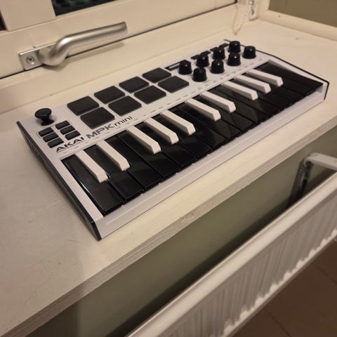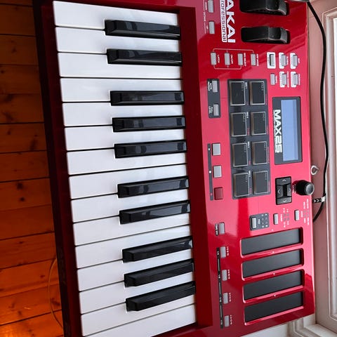 Akai MPK Mini MIDI-kontroller i svart och röd färg. En kompakt enhet med flera knappar och tangenter för musikproduktion och liveframträdanden. Utrustad med USB-anslutning för enkel koppling till datorer och kompatibla enheter.