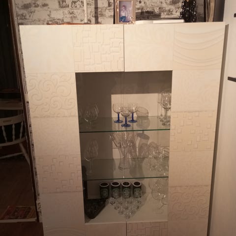 Har ett vitt, vitrinskåp till salu. Det är i nyskick ock inga skador eller dyl...för exakta mått skicka intresserad. Om man vill så kan glas ingår. Bl.a whiskeyglas, vinglas, grappa,.mmmm.mmm.