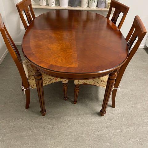Ovalt bord med 2 iläggskivor. Totalt 8 stolar varav 2 karmstolar, sits på stolarna kan tas bort och kläs om.