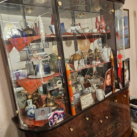 Skåpet har flera hyllplan för förvaring och visning av föremål. Designen inkluderar detaljerad träbearbetning och en bågformad överdel.