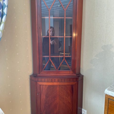 Antikt vitrinskåp tillverkat i trä med glasdörrar och dekorativa beslag. Skåpet inbyggd spot belysning som ger ett fint ljus över hyllorna.
