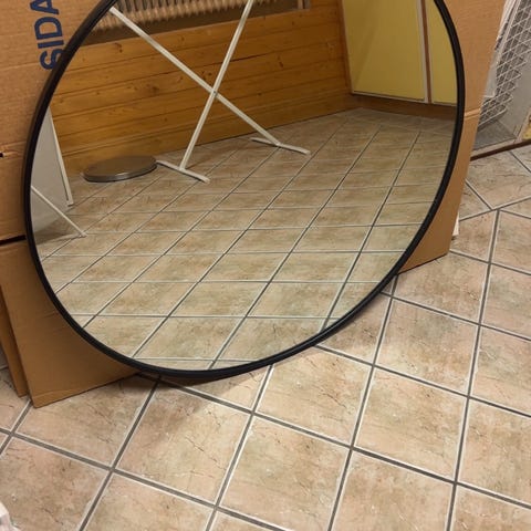 IKEA spegel med ram av trä och metallstöd. Spegeln är fristående och har en rektangulär form.
