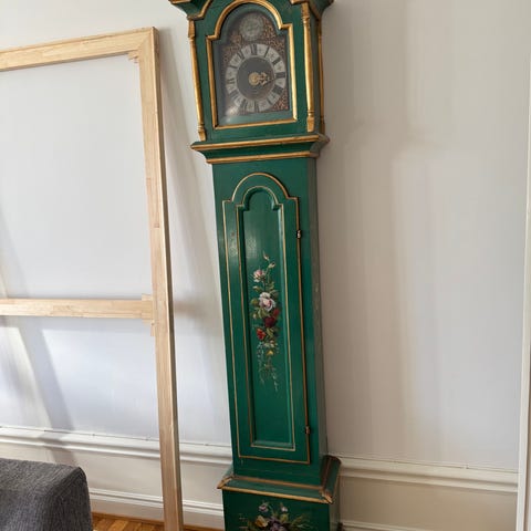 Klassisk golvur med dekorativa detaljer i guld färg. Uret har en pendel och vikter. Mekanisk. Höjd 197 cm