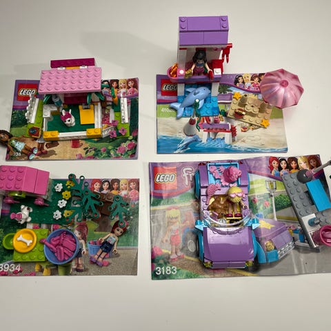 LEGO Friends byggsatser, flera olika set med små byggbara scener och figurer. Seten innehåller detaljerade tillbehör och olika teman som strand, hus och fordon. Passar för barn och samlare som är intresserade av LEGO Friends-serien.