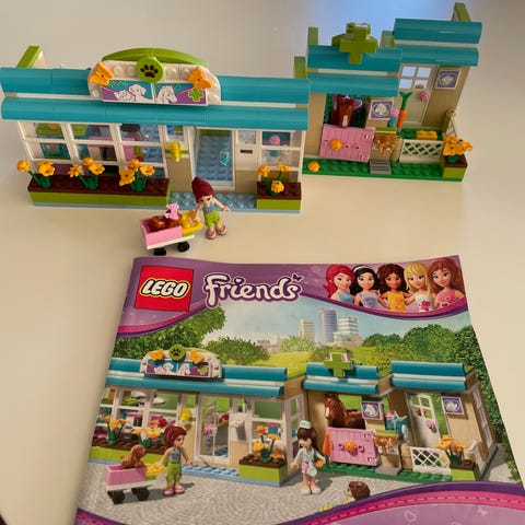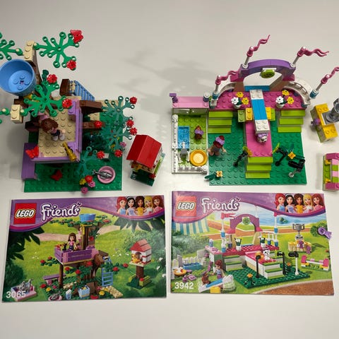LEGO Friends byggset som inkluderar flera små byggnader, fordon, figurer och tillbehör som trädbord, parasoll och djur. Seten är färgglada med inslag av rosa, lila och grönt och innehåller detaljerade delar för lek och samling.