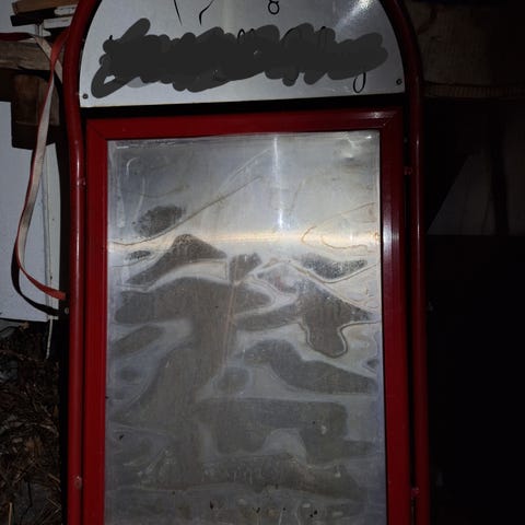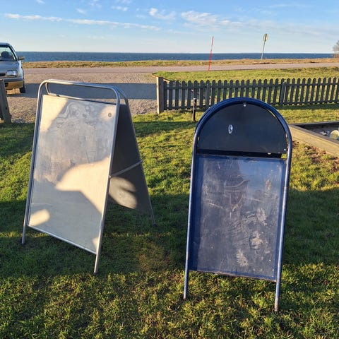 Metallskylt med ram i metall. Skylten är avsedd för informations- eller reklamsyften. Färgen är mörk med synliga märken och slitage på ytan.