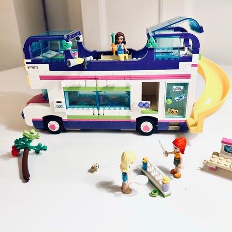 LEGO Friends Husbil med tillbehör inklusive bord, stolar, cykel och figurer. Setet innehåller flera delar i färgglada färger, främst rosa och grönt. Passar för barn och samlare.