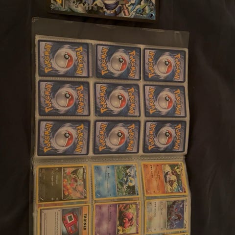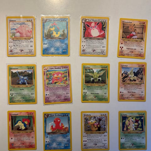 En samling Pokémon-kort i olika modeller och färger. Kortens specifika egenskaper och storlekar varierar. Används för samling eller spel.