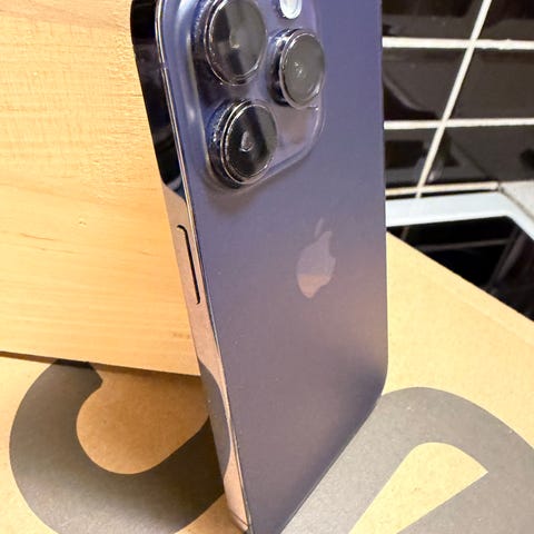 Iphone 14 Pro som är en reparerad utbytesenhet från Apple Care med 100% batterihälsa.