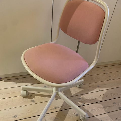 Rosa skrivbordsstol med rullhjul från IKEA säljes. Lite skavd på sidorna, i övrigt mycket bra skick. Hämtas.