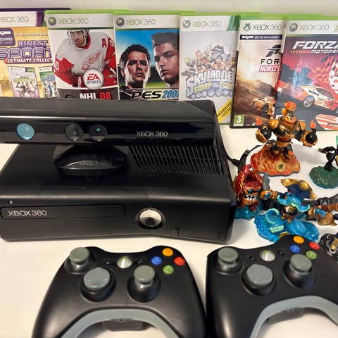 Microsoft Xbox 360 spelkonsol inklusive tre handkontroller, Kinect-sensor, och guitar hero samt skylanders.