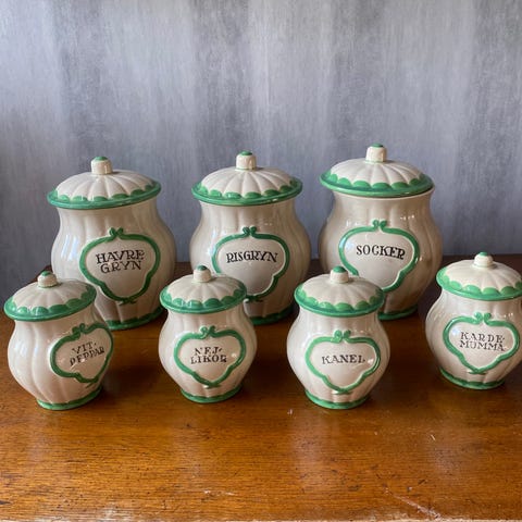 Wilhelm Kåge Pyro Gustafsberg kökskärl i keramik, inklusive burkar för kryddor och kaffe, med lock och handmålad dekor i brunt och beige. Setet innehåller olika storlekar och former för förvaring av salt, mjöl, kaffe och andra köksingredienser. 16 delar totalt. Defekter finns.