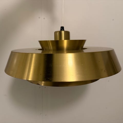 Detta är en vintage taklampa i plåt från 1970-talet i mässing från IKEA, ibland kallad "Funnel Shaped Pendant Lamp" eller "Relief. Behövs en stickkontakt.