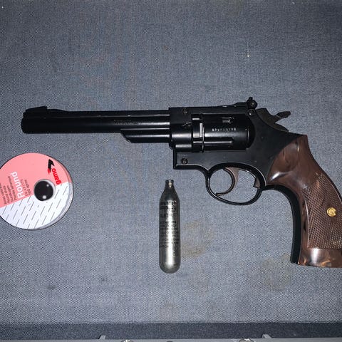 Luftpistol. Luftrevolver. Samlarobjekt eller för skytte ! En s.k. "luftpatrons-revolver"som ÄR laglig o licensfri. Max 200m/s. Alltså en luftpistol i 4,5mm, 12 patroner följer o ca 20 extra toppar till dessa med ett värde av ca 2500kr. Dock ingen pump. Revolver funkar perfekt mekaniskt, matar, indexerar o låser stumt. Detta är en intressekoll. Fler foton på telefon för de som vill. Detta är en revolver från Arminus, (Weihrauch) som fått annan pipa och trumma i vapenstål. En gedigen o tung revolver med bra, ställbara riktmedel och bra fart på kulorna ! Nu 7500 eller kom med ett bud !